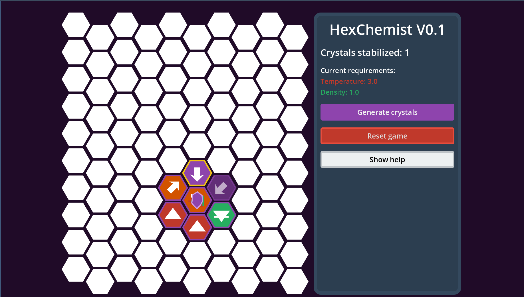 Theme implementation: Loop through elements to stabilize crystals. New crystals will be generated and need to be added to main loop or some loop that connect to the main loop. Challenge is to use smaller space possible while stabilizing the most crystals.